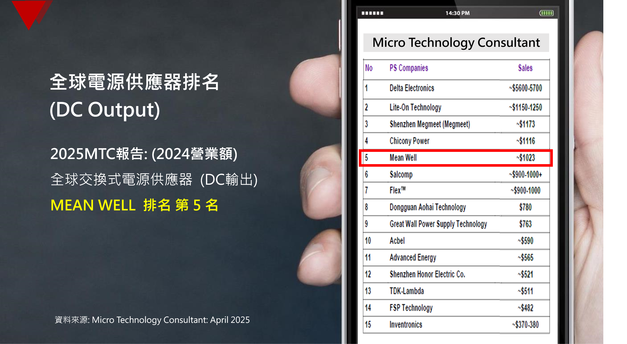 根據(jù)報(bào)告,在全球電源供應(yīng)器(DC輸出)製造商排名中,明緯名列第5,前4名電源廠大多以O(shè)DM/OEM為主要營收來源,而明緯99%營收來自標(biāo)準(zhǔn)電源,是以自有品牌MEAN WELL為主要經(jīng)營策略的電源廠商。